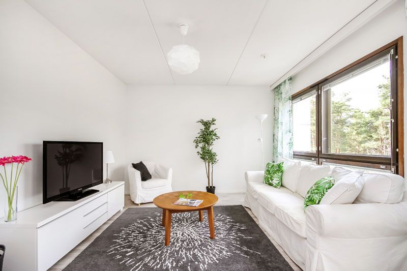 En ljus triangel på tredje våningen. Ljusa laminatgolv och vita väggar skapar grunden för en mängd olika inredningsstilar. En separat toalett gör vardagen enklare. Det finns en rymlig inglasad balkong i anslutning till det kombinerade vardagsrummet och matplatsen. Balkongen erbjuder vidsträckt utsikt över gården och skogen.