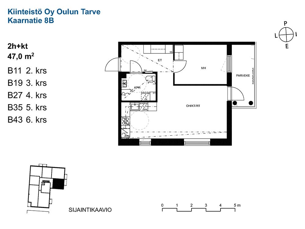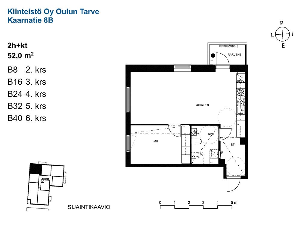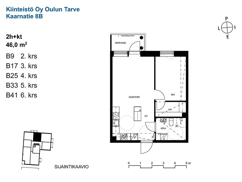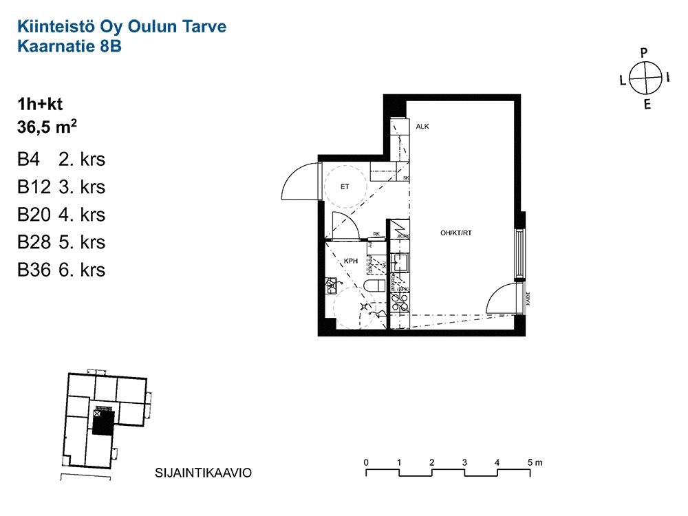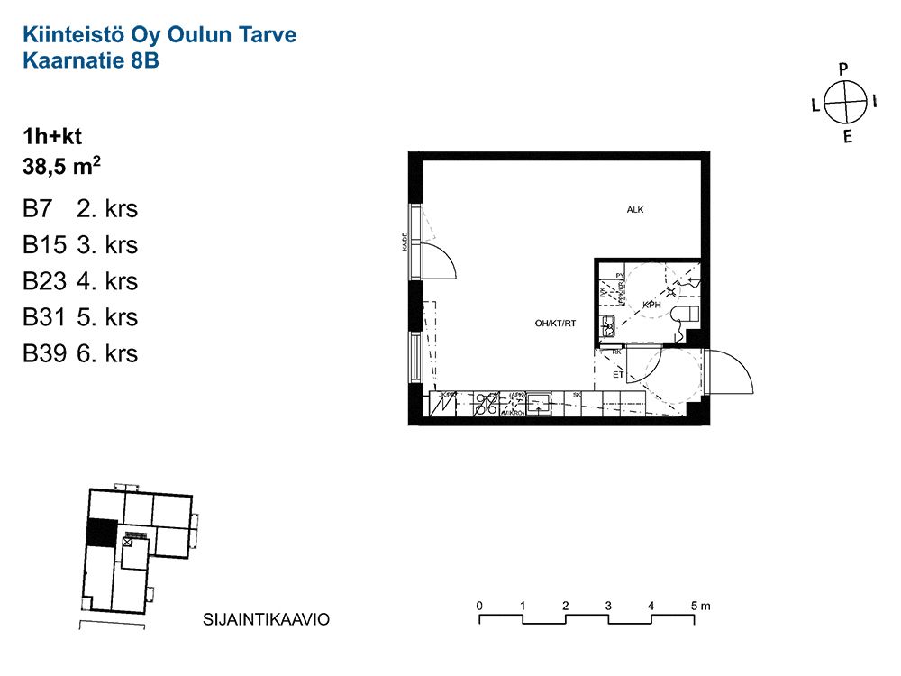 Hyreslägenheterna på Kaarnatie 8 B ligger i Alppila, som ligger cirka 2,5 kilometer från Uleåborgs centrum. Grundläggande service, såsom livsmedelsbutiker, gym och bowlinghall, finns i närheten av lägenheterna. Välivainio och Tuira, daghem och skolor finns också i närheten. Området har smidiga transportförbindelser, både med bil och kollektivtrafik. Resan är bekväm till stadens centrum, Uleåborgs universitet och Yrkeshögskolan, till exempel.