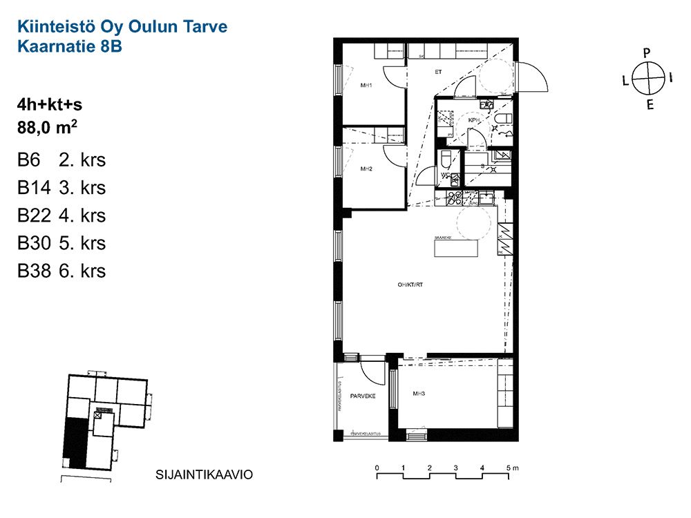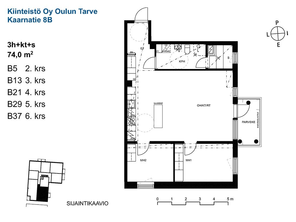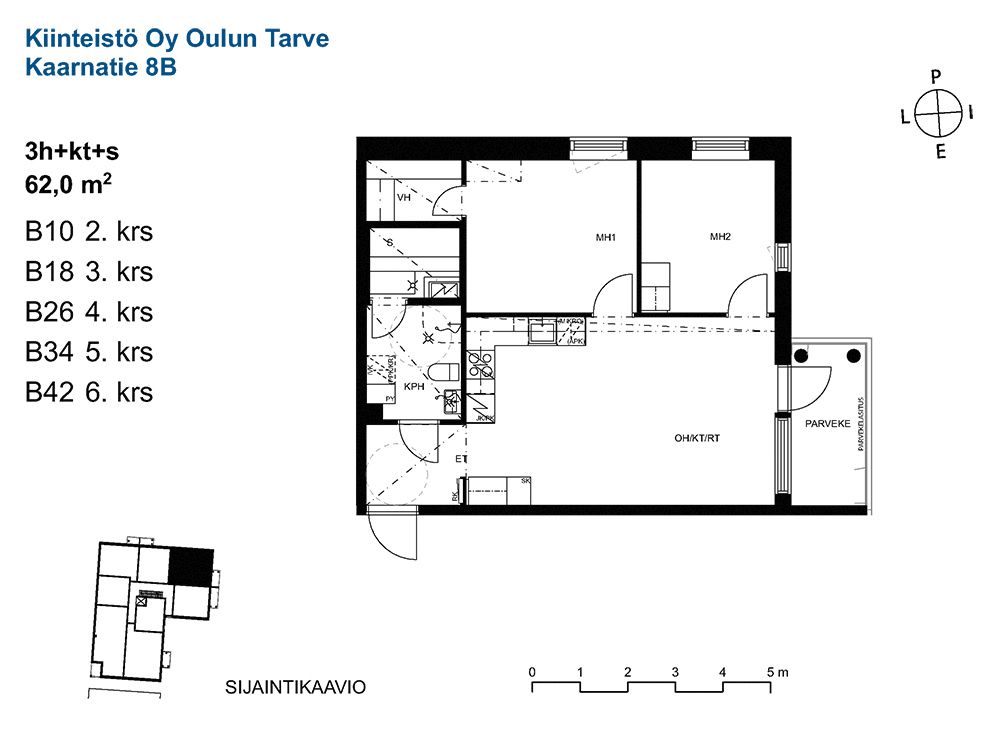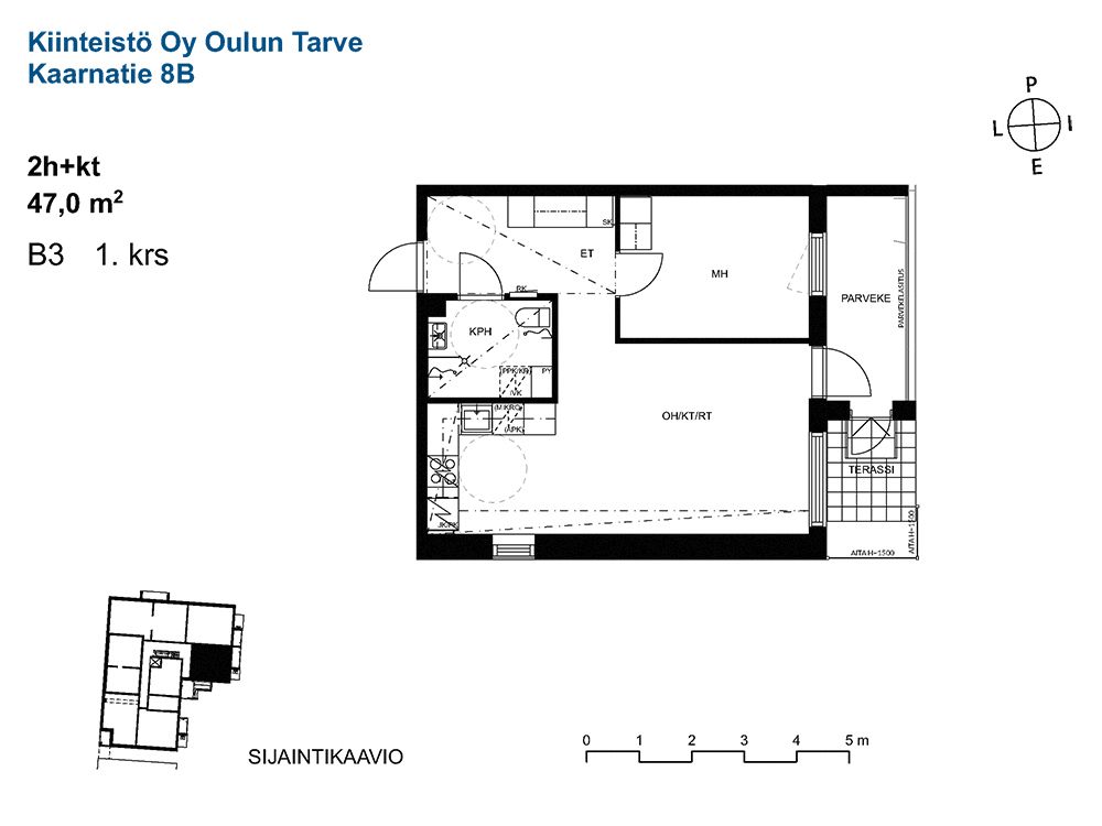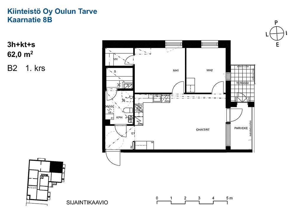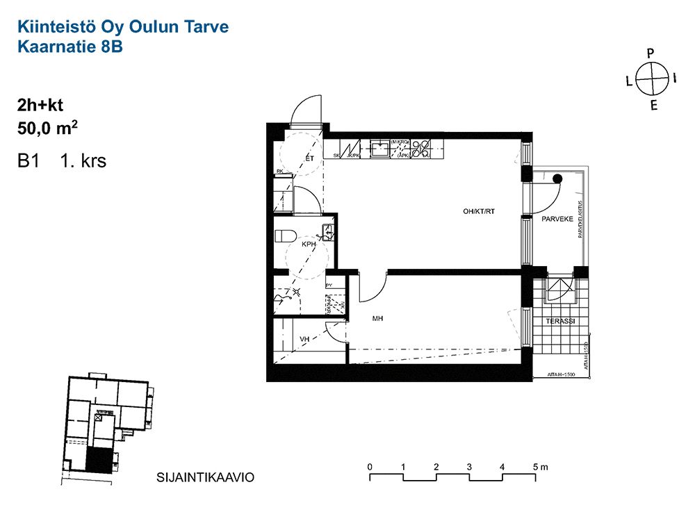 Hyreslägenheterna på Kaarnatie 8 B ligger i Alppila, som ligger cirka 2,5 kilometer från Uleåborgs centrum. Grundläggande service, såsom livsmedelsbutiker, gym och bowlinghall, finns i närheten av lägenheterna. Välivainio och Tuira, daghem och skolor finns också i närheten. Området har smidiga transportförbindelser, både med bil och kollektivtrafik. Resan är bekväm till stadens centrum, Uleåborgs universitet och Yrkeshögskolan, till exempel.