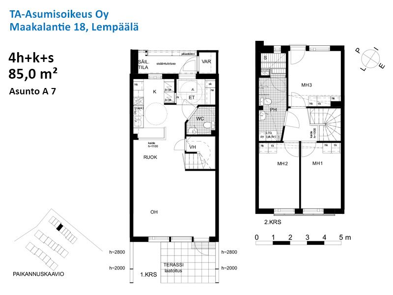 Lägenheterna i byggnad A är i två plan och lägenheterna i de andra byggnaderna är i ett plan. Lägenheterna har bastu och kapprum, golven är laminatgolv och badrummen är kaklade. Alla lägenheter har också egen gård i väst-söderläge samt kyl- och förrådsrum vid entrén. Lägenheterna i byggnad A har även ett eget varmt förråd i gårdsbyggnaden, där det också finns ett gemensamt förråd för utomhusutrustning. Parkeringsplatser med värmeproppar finns på parkeringsplatsen. Radhusen på Maakalantie 18 färdigställdes 2018 och husen på Maakalantie 22 2016 längs Lempäälä kanal. Husen ligger i Maakalan by, ett bostadsområde vid sjön Vanajavesi och nära stadens centrum. Husens gårdsområden är omgivna av parkområden samt lekplatser och rekreationsområden. Längs kanalstranden kan du promenera mindre än tre kilometer längs en naturskön väg till Lempäälä centrum, där du hittar ett brett utbud av tjänster, inklusive livsmedelsbutiker och andra butiker, ett bibliotek, en bank, FPA och en hälsocentral. Det finns också daghem och skolor i omgivningarna, en idrottsplan och ett idrottscenter samt en ishall. Du kan nå Ideapark på tio minuter med bil. De närmaste busshållplatserna ligger cirka en kilometer bort längs Tampereentie och tågstationen ligger cirka två kilometer bort i centrum. Med egen bil kan du också enkelt och snabbt resa till olika delar av Finland via trevägsvägen.